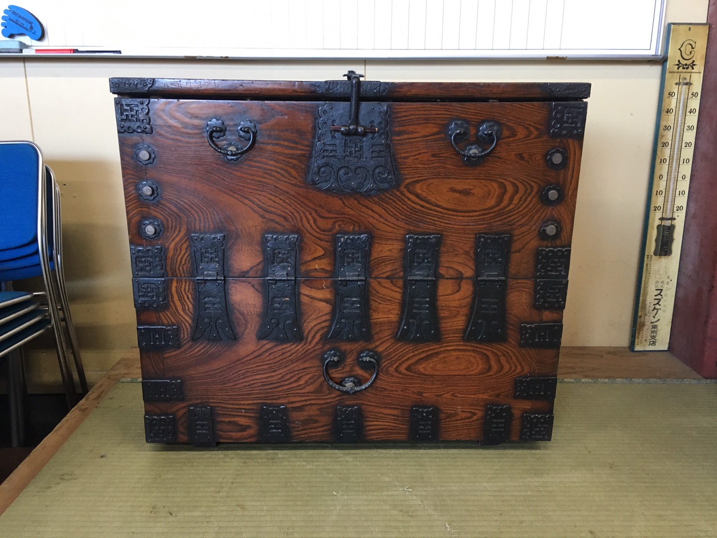さて、本日は川口市にて年代物の時代箪笥の引き取りに行ってきました。今回の時代箪笥は、華やかなケヤキの木目の演出が大変美しい和製アンティークの時代箪笥でした。特に、大きく重厚な金具の作り込みや下の板が見えないほどの引き戸の細かい横桟が凄く魅力的で、当時の職人の技の素晴らしさやこだわりを感じさせられます。